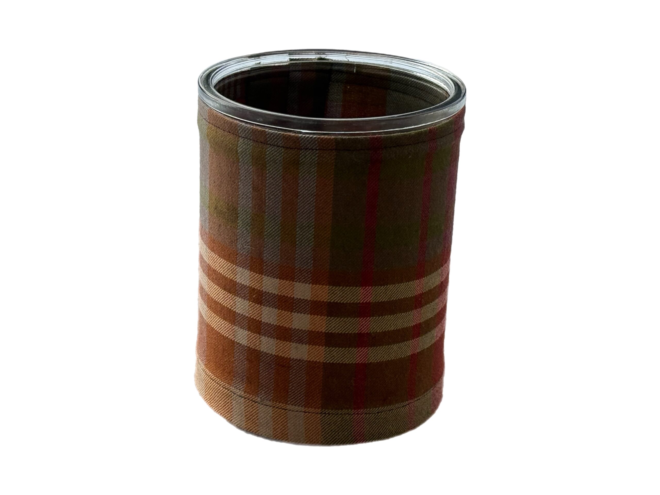 Glassvase med Mulberry Ancient tartan tekstil til blomst eller oppbevaring, lyslykter etc. Stoffet kan trekkes ned hvis du har stearinlys i den, så du ser flammen. Str er Ø14×18 cm