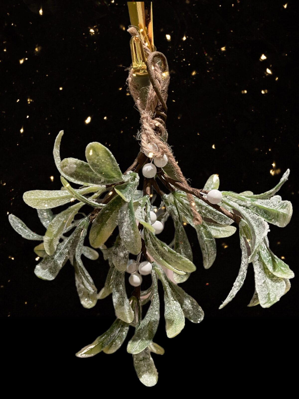 Søt misteltein med litt diskret glitter og hvite bær. Hyggelig å henge over døren eller bare pynte en julegave med.