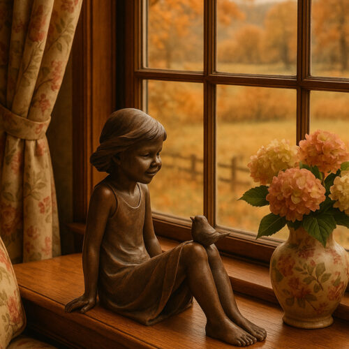Et stemningsfullt kunstverk som fanger barndommens undring. Denne statuetten viser en pike sittende i stille samspill med en fugl – i bronselook- et symbol på lek, frihet og nærhet til naturen. Utført med flotte detaljer og en varm overflate som gir figuren liv. En tidløs dekorasjon som bringer ro og poesi til hjem eller hage.