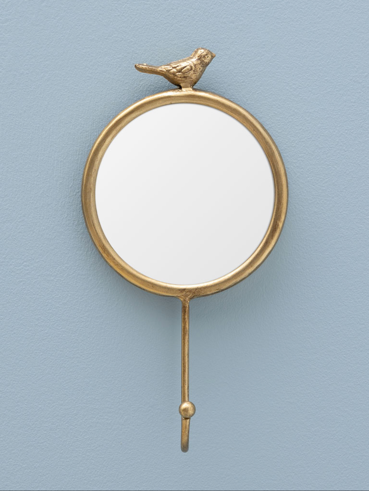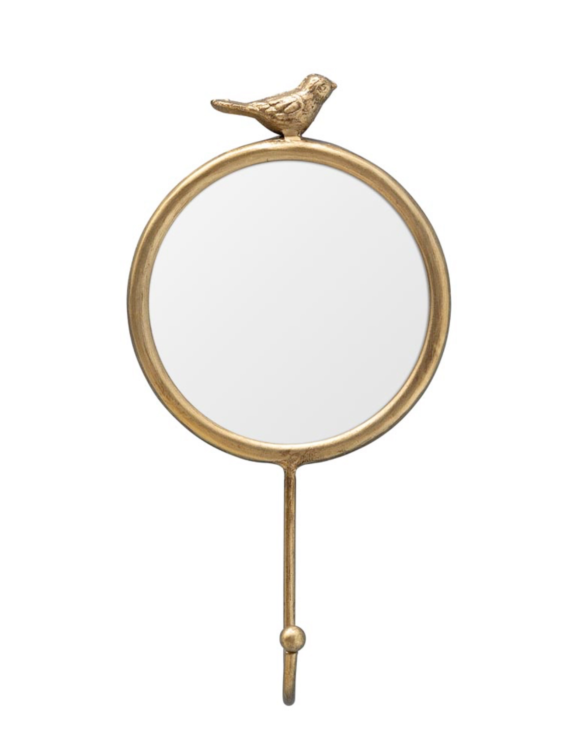 Dekorativt speil i antikk gullfinish med en liten fugl på toppen og en praktisk krok nederst. Et sjarmerende interiørelement som kombinerer funksjon og pynt – perfekt til entré, soverom eller bad.