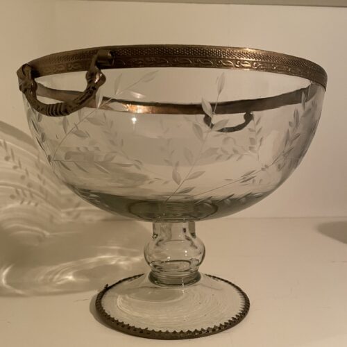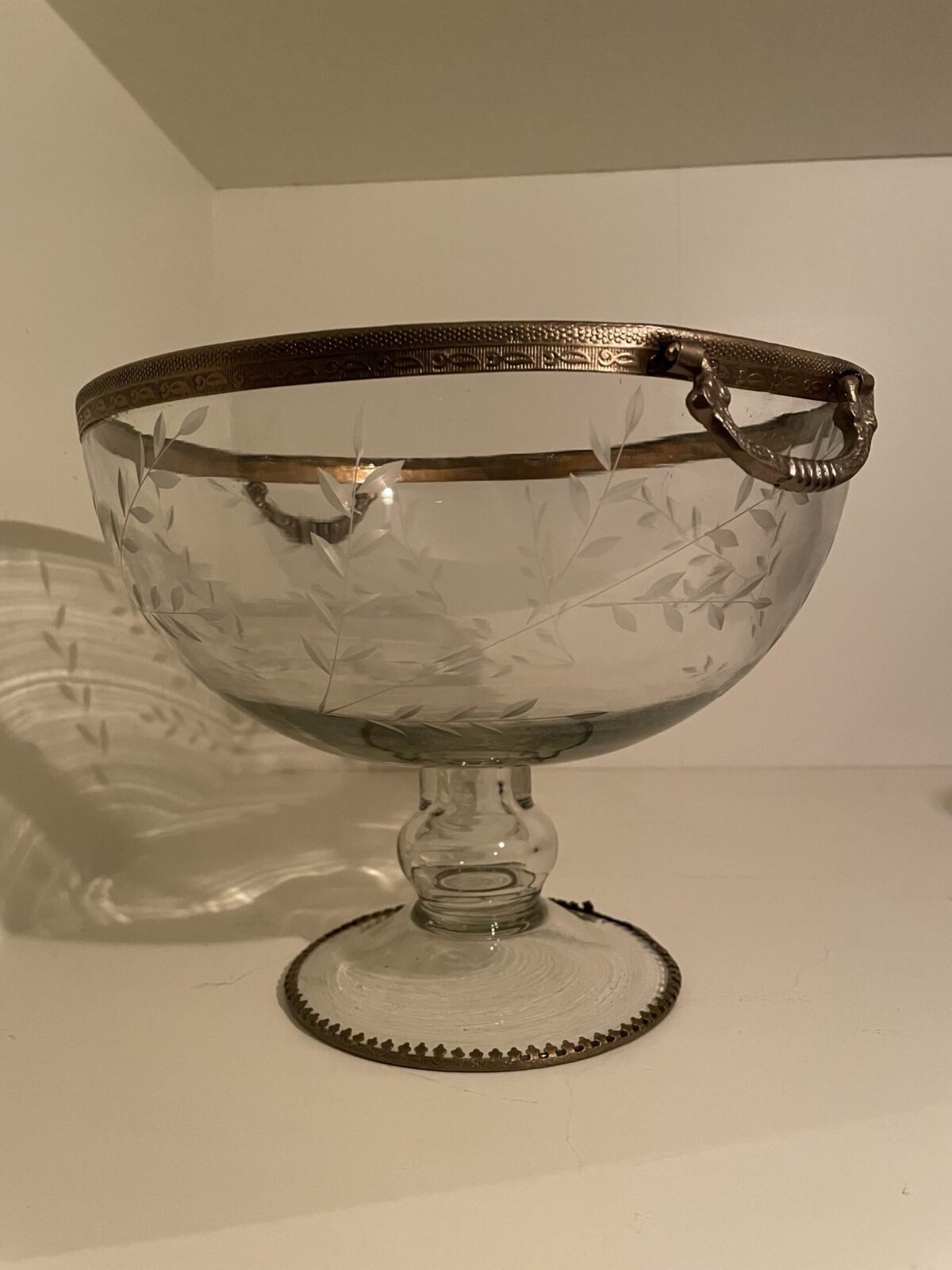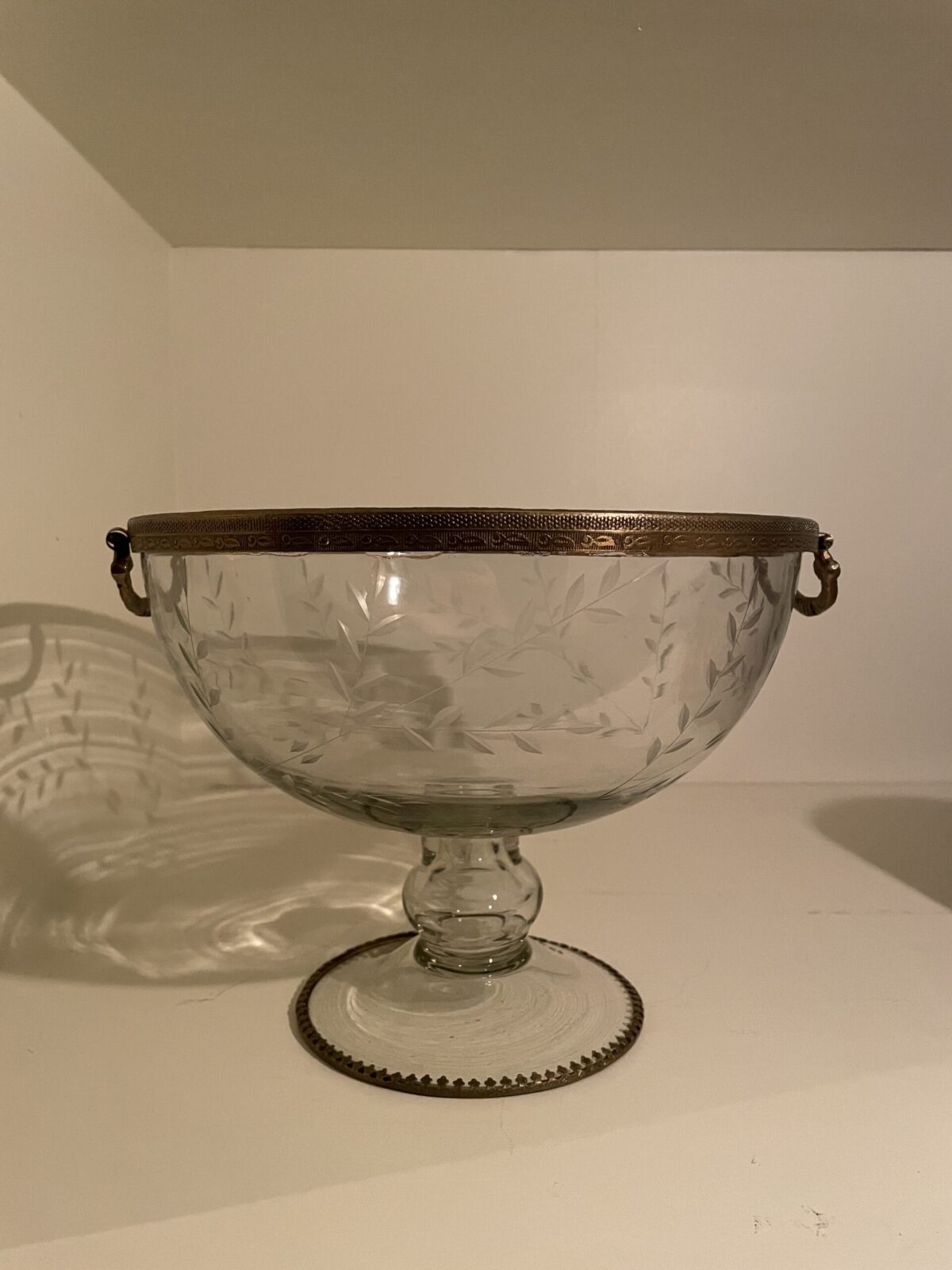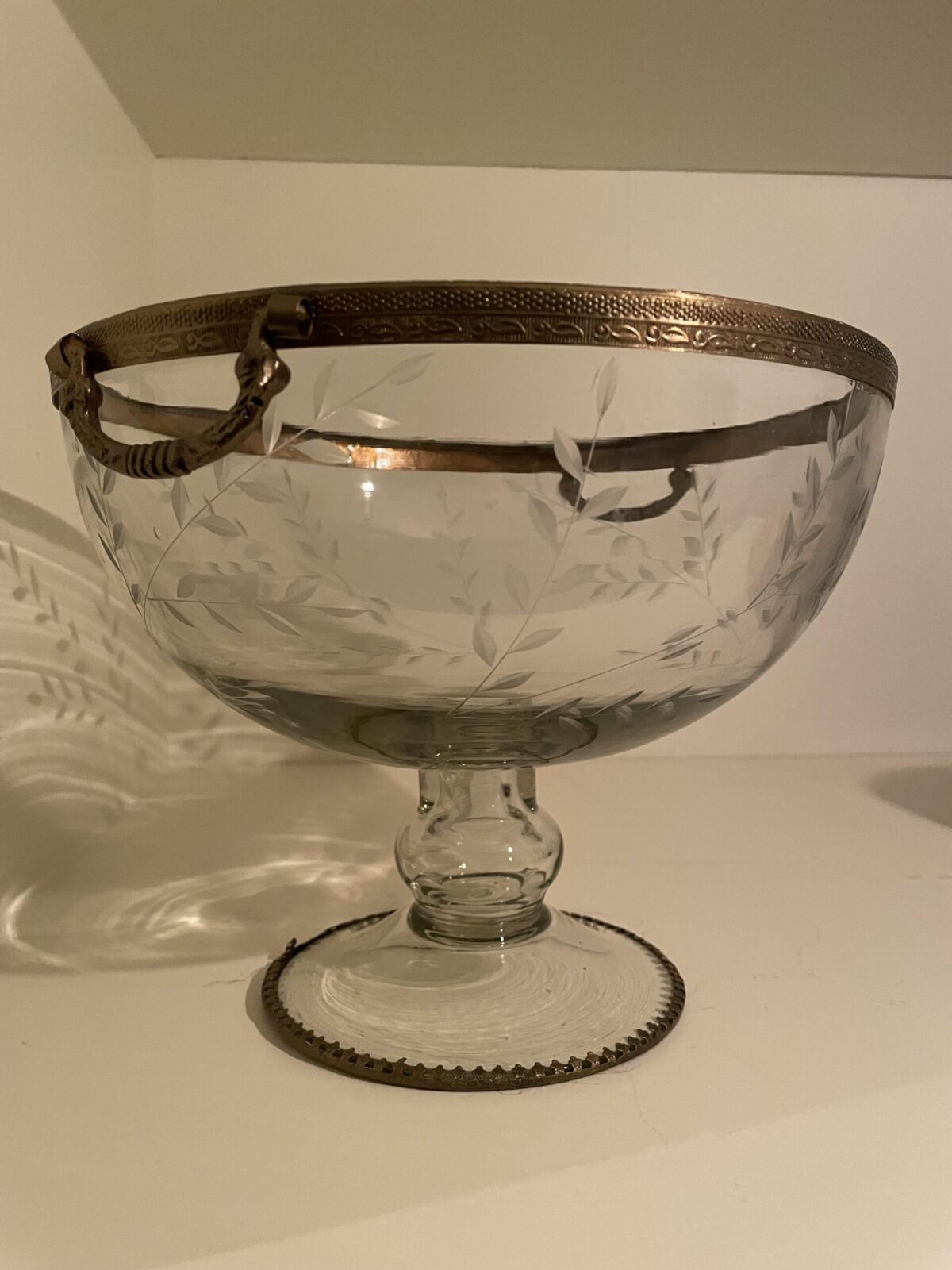 Vakker glassbolle på stett med messingdekor og slipte bladranker i glasset.